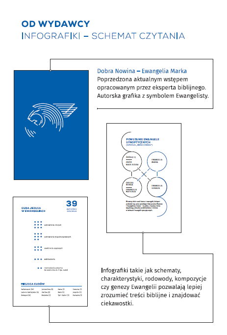 Ewangelia Marka wzbogacona została o 14 autorskich infografik, które rozmieszczone w tekście pozwalają czytelnikowi na lepsze zrozumienie treści Ewangelii.