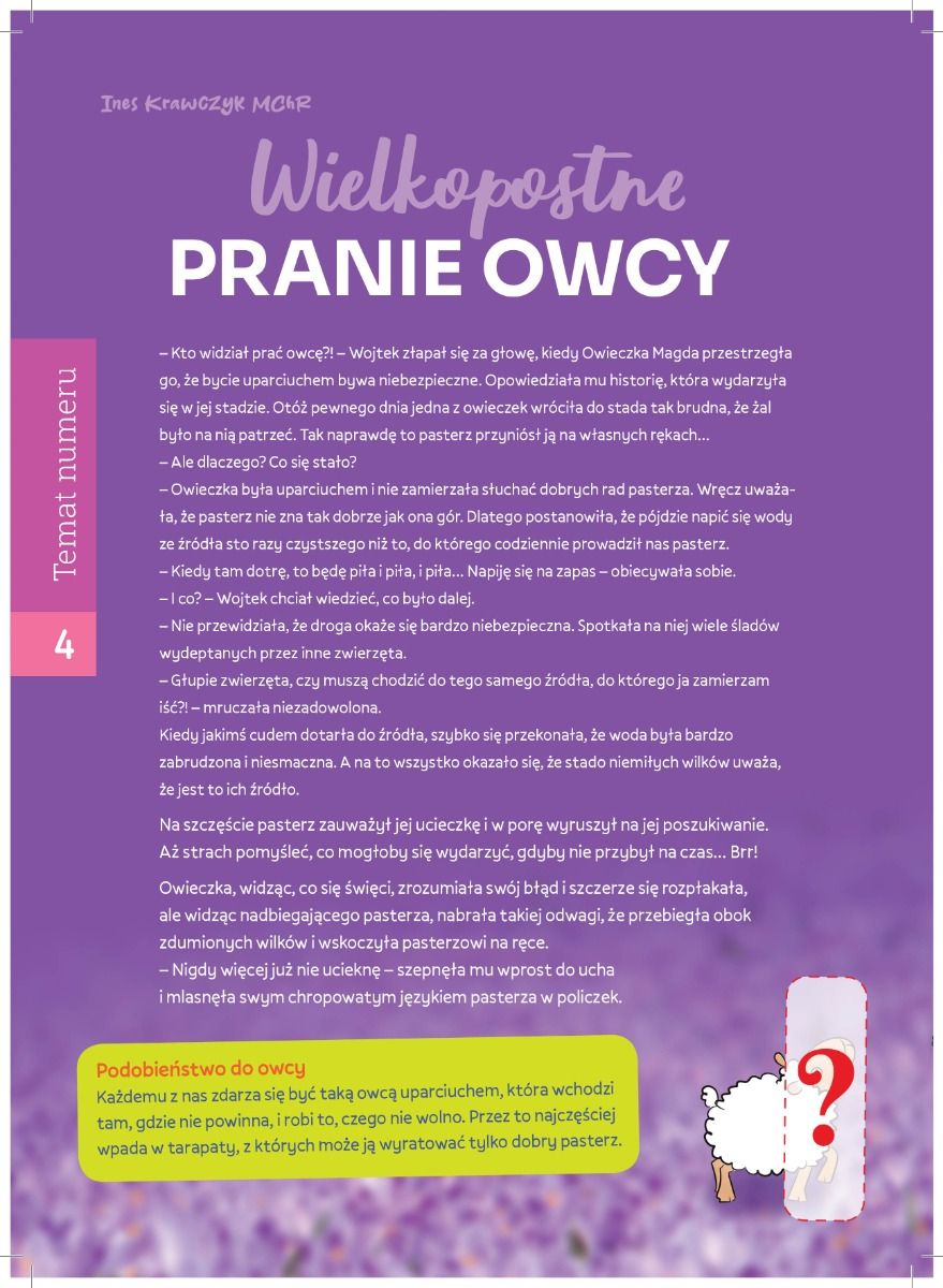 Wielki Post to czas wielkiego sprzątania – nie kurzu spod łóżka, ale tego, co czasem „brudzi” serce. Dzieci dowiedzą się, dlaczego nikt nie lubi chodzić „umorusany” jak owieczka, która nie słuchała Dobrego Pasterza, i jak dzięki dobrym decyzjom oraz spowiedzi można znów stać się czystym i radosnym.