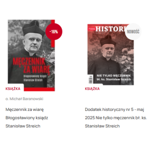 - Dodatek historyczny nr 5 - maj 2025 Nie tylko męczennik bł. ks. Stanisław Streich a w nim m.in. archiwalny materiał z „Przewodnika Katolickiego” z 1938 r. – tuż po zabójstwie ks. Streicha oraz nowe już dedykowane tematycznie artykuły o błogosławionym.