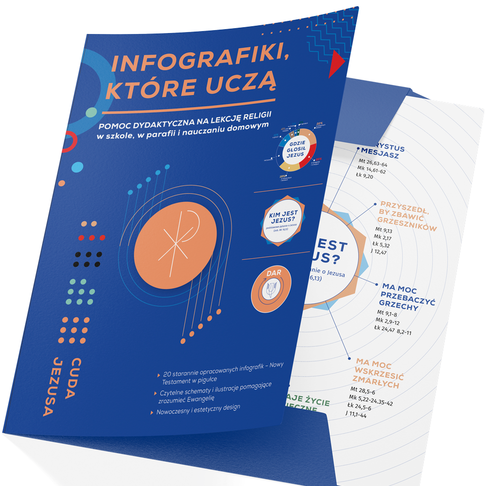 20 infografik dotyczących Nowego Testamentu to unikalny komplet dydaktyczny, który w przejrzysty i atrakcyjny sposób przedstawia kluczowe wydarzenia, postacie i przesłanie Biblii. Dzięki nowoczesnej formie graficznej ułatwia zrozumienie Pisma Świętego, czyniąc jego treść bardziej przystępną dla uczniów i dla osób pragnących pogłębić wiedzę biblijną.