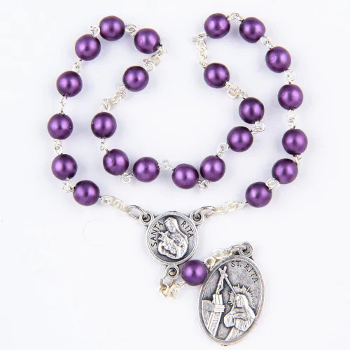Różaniec z medalikiem Św. Rity. Paciorki w kolorze ciemnofioletowym.
